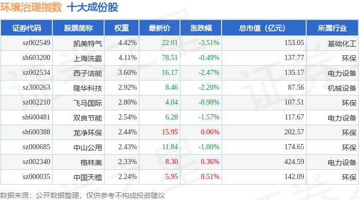环境治理(399806)指数十大成份股详情如下:
