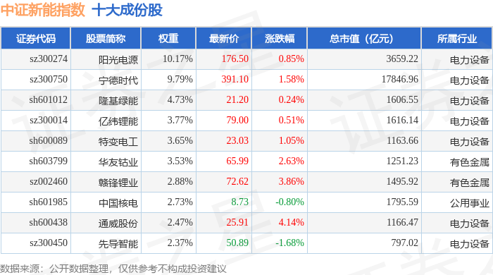 中证新能(399808)指数十大成份股详情如下: