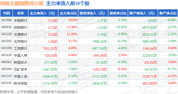 资金流向方面,保险主题(399809)指数成份股当日主力资金净流出合计1.85亿元,游资资金净流出合计3.44亿元,散户资金净流入合计5.29亿元。成份股资金流向详情见下表: