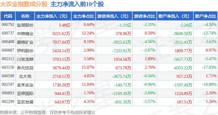资金流向方面,大农业(399814)指数成份股当日主力资金净流出合计3504.8万元,游资资金净流出合计3.46亿元,散户资金净流入合计3.81亿元。成份股资金流向详情见下表: