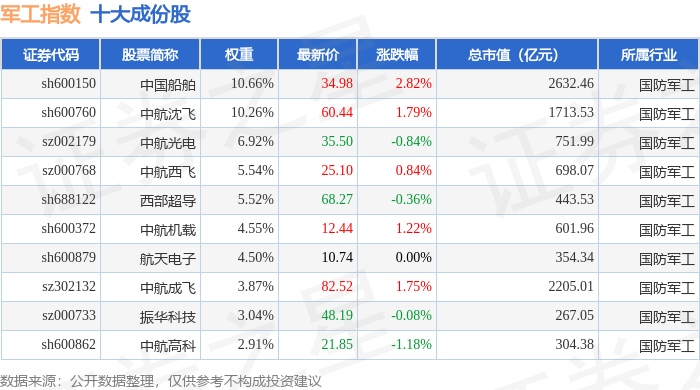 资金流向方面,军工指数(399959)成份股当日主力资金净流入合计6.05亿元,游资资金净流出合计2.07亿元,散户资金净流出合计3.98亿元。成份股资金流向详情见下表:
