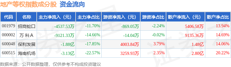 资金流向方面,地产等权(399983)指数成份股当日主力资金净流出合计6.38亿元,游资资金净流入合计6380.68万元,散户资金净流入合计5.74亿元。成份股资金流向详情见下表: