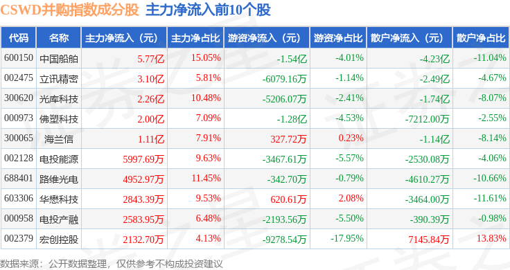 资金流向方面,CSWD并购(399992)指数成份股当日主力资金净流出合计3.61亿元,游资资金净流入合计6481.83万元,散户资金净流入合计2.84亿元。成份股资金流向详情见下表: