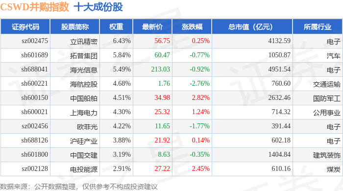 CSWD并购(399992)指数十大成份股详情如下: