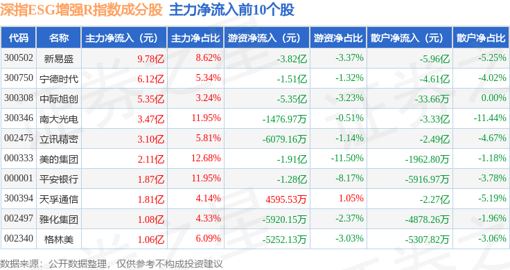 资金流向方面,深指ESG增强R(470032)指数成份股当日主力资金净流出合计39.5亿元,游资资金净流出合计7.09亿元,散户资金净流入合计46.59亿元。成份股资金流向详情见下表: