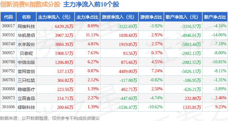 资金流向方面,创新消费R(470041)指数成份股当日主力资金净流出合计16.96亿元,游资资金净流入合计4.33亿元,散户资金净流入合计12.63亿元。成份股资金流向详情见下表: