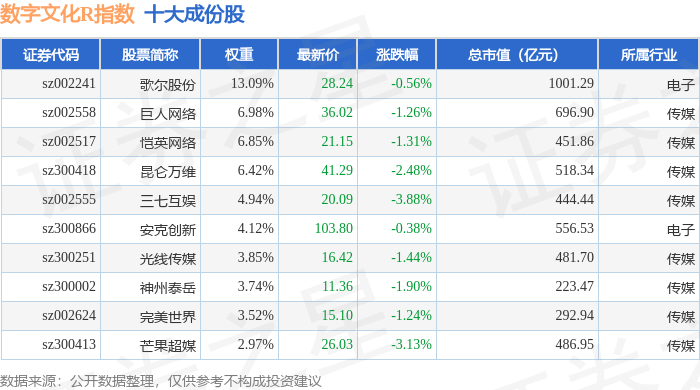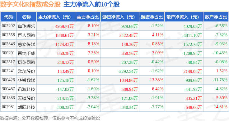 资金流向方面,数字文化R(470047)指数成份股当日主力资金净流出合计21.65亿元,游资资金净流入合计6.67亿元,散户资金净流入合计14.98亿元。成份股资金流向详情见下表: