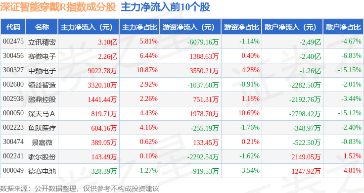 资金流向方面,深证智能穿戴R(470074)指数成份股当日主力资金净流出合计17.38亿元,游资资金净流入合计3.07亿元,散户资金净流入合计14.31亿元。成份股资金流向详情见下表: