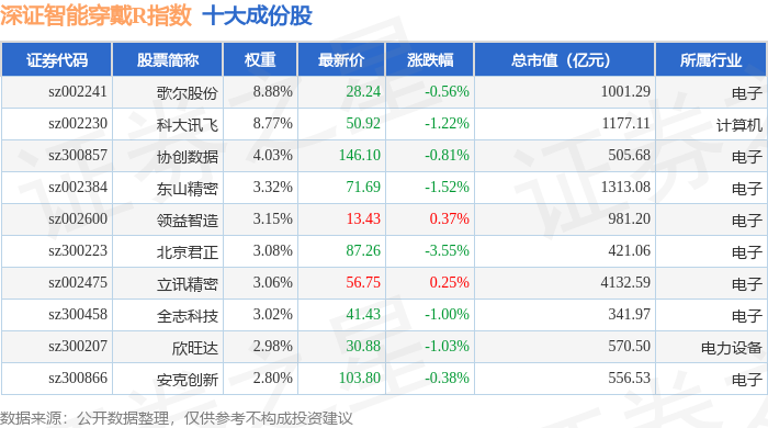深证智能穿戴R(470074)指数十大成份股详情如下: