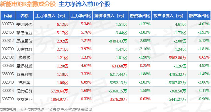 资金流向方面,新能电池R(480032)指数成份股当日主力资金净流入合计5665.73万元,游资资金净流出合计8.01亿元,散户资金净流入合计7.36亿元。成份股资金流向详情见下表: