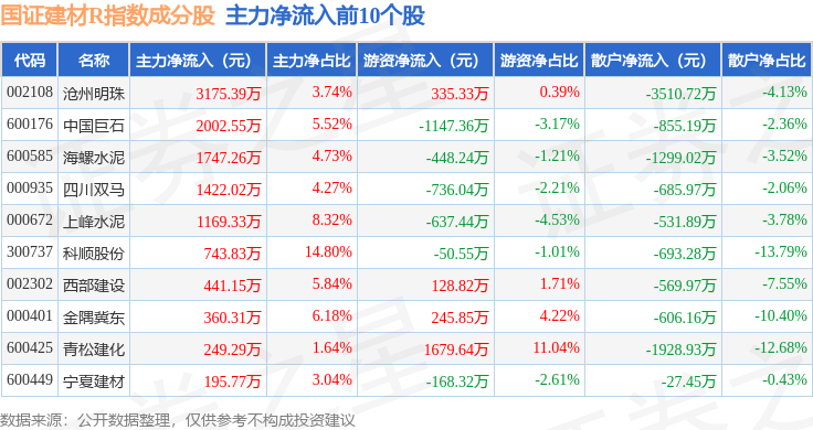 资金流向方面,国证建材R(480048)指数成份股当日主力资金净流出合计3.34亿元,游资资金净流入合计2100.45万元,散户资金净流入合计3.13亿元。成份股资金流向详情见下表: