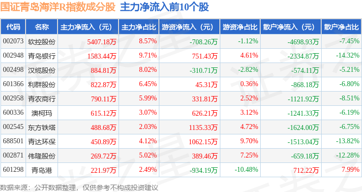 资金流向方面,国证青岛海洋R(480532)指数成份股当日主力资金净流出合计1.53亿元,游资资金净流入合计1211.79万元,散户资金净流入合计1.23亿元。成份股资金流向详情见下表: