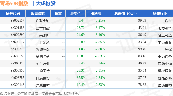 证券之星消息,11月19日,青岛50R(489011)指数报收于2712.79点,涨0.0%,成交72.6亿元,换手率1.32%。当日该指数成份股中,上涨的有10家,青达环保以6.11%的涨幅领涨,下跌的有31家,海联金汇以3.21%的跌幅领跌。