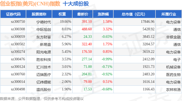 创业板指(美元)(CNH)(970007)指数十大成份股详情如下: