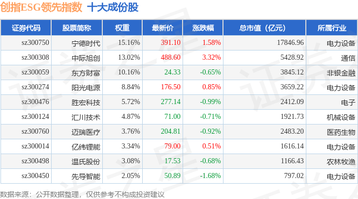 创指ESG领先(970031)指数十大成份股详情如下: