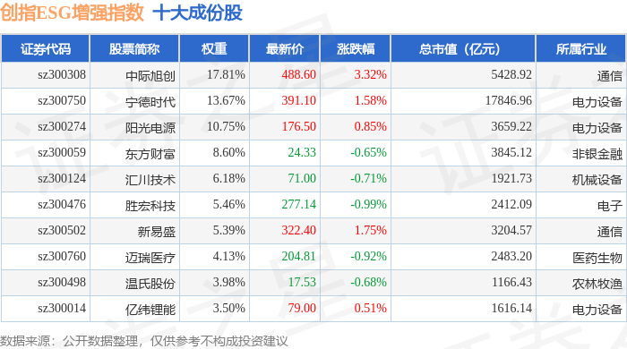 证券之星消息,11月19日,创指ESG增强(970034)指数报收于2877.84点,涨0.69%,成交862.82亿元,换手率1.32%。当日该指数成份股中,上涨的有15家,中际旭创以3.32%的涨幅领涨,下跌的有25家,晶盛机电以3.34%的跌幅领跌。