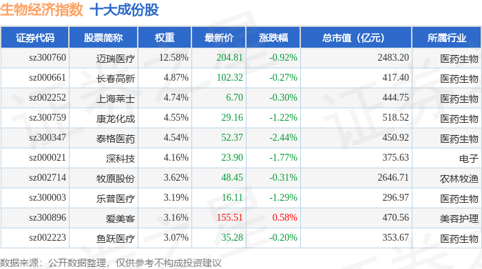 证券之星消息,11月19日,生物经济(970038)指数报收于2182.31点,跌0.94%,成交134.62亿元,换手率1.08%。当日该指数成份股中,上涨的有7家,信立泰以0.83%的涨幅领涨,下跌的有42家,华兰疫苗以5.98%的跌幅领跌。