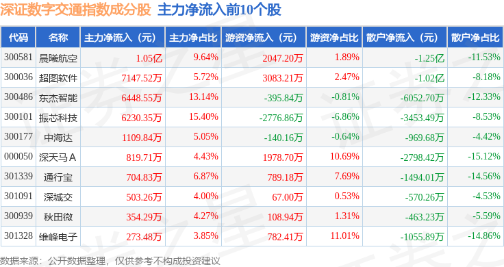 资金流向方面,深证数字交通(970049)指数成份股当日主力资金净流出合计7.47亿元,游资资金净流入合计2.7亿元,散户资金净流入合计4.77亿元。成份股资金流向详情见下表: