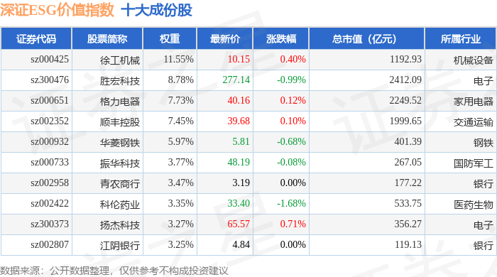 证券之星消息,11月19日,深证ESG价值(970061)指数报收于1604.25点,跌0.4%,成交201.02亿元,换手率1.19%。当日该指数成份股中,上涨的有7家,大金重工以2.91%的涨幅领涨,下跌的有38家,七匹狼以7.36%的跌幅领跌。