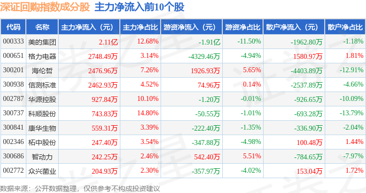 资金流向方面,深证回购(970063)指数成份股当日主力资金净流出合计8.68亿元,游资资金净流入合计5890.33万元,散户资金净流入合计8.09亿元。成份股资金流向详情见下表: