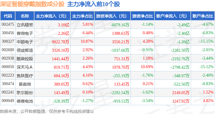 资金流向方面,深证智能穿戴(970074)指数成份股当日主力资金净流出合计17.38亿元,游资资金净流入合计3.07亿元,散户资金净流入合计14.31亿元。成份股资金流向详情见下表: