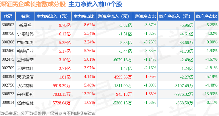 资金流向方面,深证民企成长(970071)指数成份股当日主力资金净流入合计18.05亿元,游资资金净流出合计13.7亿元,散户资金净流出合计4.34亿元。成份股资金流向详情见下表: