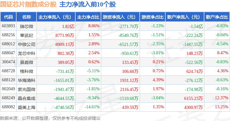 资金流向方面,国证芯片(980017)指数成份股当日主力资金净流出合计29.07亿元,游资资金净流入合计8.03亿元,散户资金净流入合计21.04亿元。成份股资金流向详情见下表:
