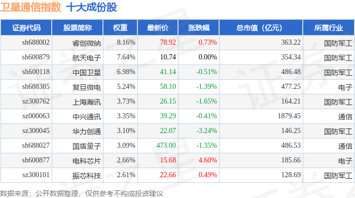 证券之星消息,11月19日,卫星通信(980018)指数报收于3651.39点,跌0.55%,成交268.22亿元,换手率1.03%。当日该指数成份股中,上涨的有10家,亚光科技以19.93%的涨幅领涨,下跌的有38家,普天科技以5.76%的跌幅领跌。