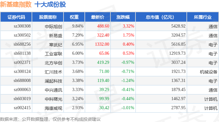 证券之星消息,11月19日,新基建(980029)指数报收于6946.62点,涨0.1%,成交992.16亿元,换手率0.76%。当日该指数成份股中,上涨的有14家,中际旭创以3.32%的涨幅领涨,下跌的有34家,北京君正以3.55%的跌幅领跌。