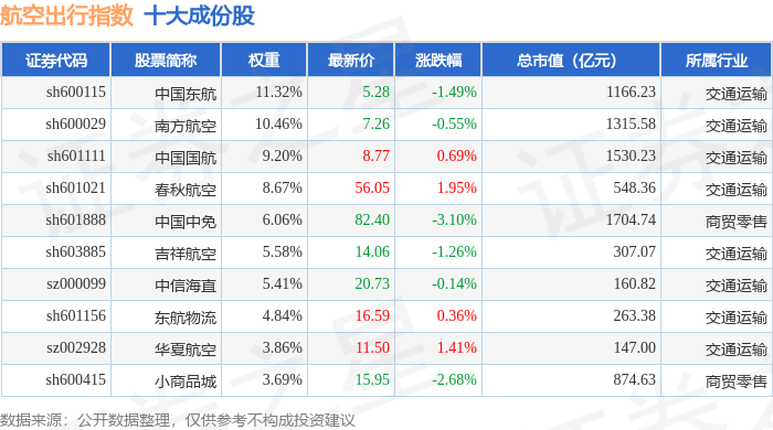 证券之星消息,11月19日,航空出行(980059)指数报收于1608.47点,跌0.69%,成交276.18亿元,换手率2.27%。当日该指数成份股中,上涨的有29家,云南旅游以10.05%的涨幅领涨,下跌的有48家,华联控股以10.0%的跌幅领跌。