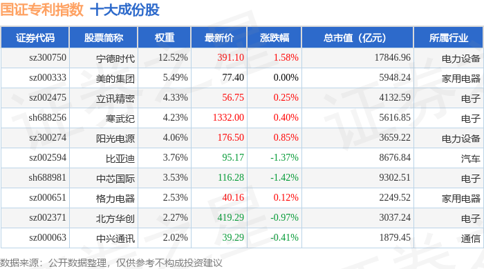 证券之星消息,11月19日,国证专利(980070)指数报收于3609.02点,跌0.07%,成交1205.45亿元,换手率0.86%。当日该指数成份股中,上涨的有26家,争光股份以5.07%的涨幅领涨,下跌的有71家,信科移动以3.31%的跌幅领跌。