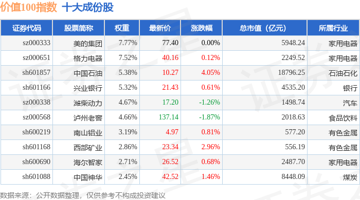 证券之星消息,11月19日,价值100(980081)指数报收于4419.98点,涨0.5%,成交435.53亿元,换手率0.72%。当日该指数成份股中,上涨的有46家,海陆重工以10.04%的涨幅领涨,下跌的有49家,济川药业以2.98%的跌幅领跌。