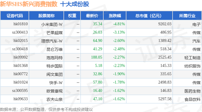 新华SHS新兴消费(989006)指数十大成份股详情如下: