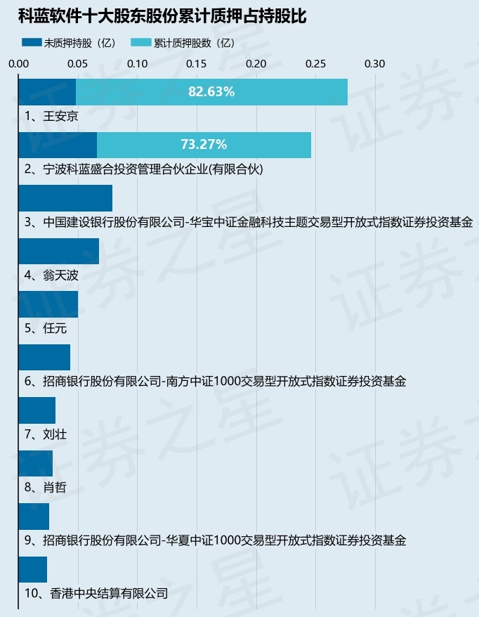 截止本公告日,股东王安京已累计质押股份2290.0万股,占其持股总数的82.63%,股东宁波科蓝盛合投资管理合伙企业(有限合伙)已累计质押股份1805.0万股,占其持股总数的73.27%。本次质押后科蓝软件十大股东的累计质押股份占持股比例(占持股比例的计算以公司最新一期财务报表公布的十大股东的持股总数为基准)见下图: