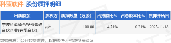 证券之星消息,科蓝软件(300663)11月19日公开信息显示,股东宁波科蓝盛合投资管理合伙企业(有限合伙)向孙*合计质押100.0万股,占总股本0.21%。质押详情见下表: