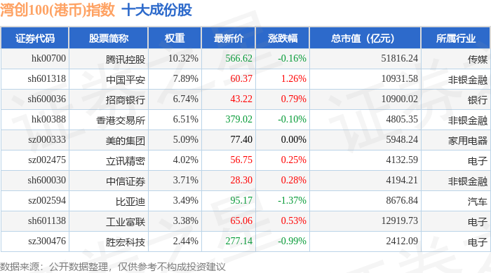 湾创100(港币)(980002)指数十大成份股详情如下: