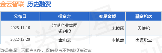 证券之星消息,根据天眼查APP于11月16日公布的信息整理,无锡金云智联科技有限公司天使轮融资,融资额未披露,参与投资的机构包括滨湖产业集团,锡创投。
