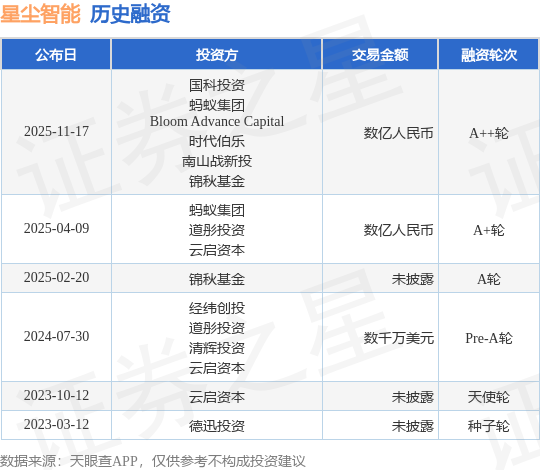 证券之星消息,根据天眼查APP于11月17日公布的信息整理,星尘智能(深圳)有限公司A++轮融资,融资额数亿人民币,参与投资的机构包括国科投资,蚂蚁集团,Bloom Advance Capital,时代伯乐,南山战新投,锦秋基金。