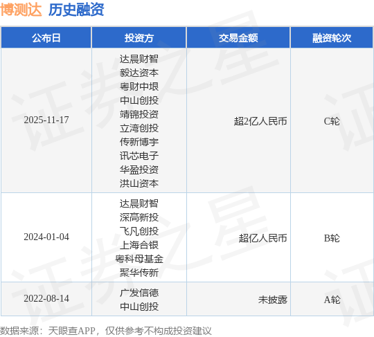 证券之星消息,根据天眼查APP于11月17日公布的信息整理,广东博测达科技股份有限公司C轮融资,融资额超2亿人民币,参与投资的机构包括达晨财智,毅达资本,粤财中垠,中山创投,靖锦投资,立湾创投,传新博宇,讯芯电子,华盈投资,洪山资本。