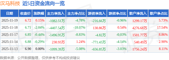 证券之星消息,截至2025年11月19日收盘,汉马科技(600375)报收于6.72元,上涨0.15%,换手率3.13%,成交量34.01万手,成交额2.27亿元。