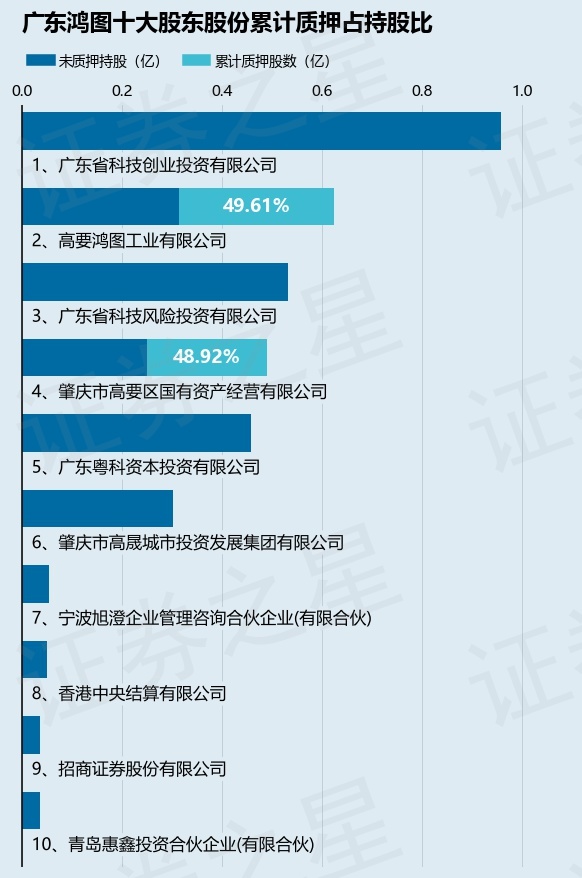 截止本公告日,股东高要鸿图工业有限公司已累计质押股份3100.0万股,占其持股总数的49.61%,股东肇庆市高要区国有资产经营有限公司已累计质押股份2400.0万股,占其持股总数的48.92%。本次质押后广东鸿图十大股东的累计质押股份占持股比例(占持股比例的计算以公司最新一期财务报表公布的十大股东的持股总数为基准)见下图: