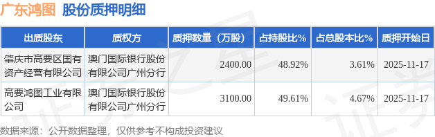 证券之星消息,广东鸿图(002101)11月20日公开信息显示,股东肇庆市高要区国有资产经营有限公司、高要鸿图工业有限公司向澳门国际银行股份有限公司广州分行合计质押5500.0万股,占总股本8.28%。质押详情见下表: