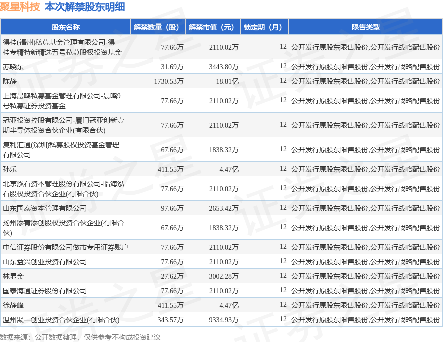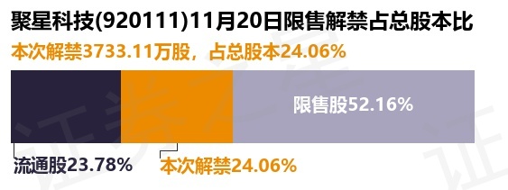 证券之星消息,根据市场公开信息整理,聚星科技(920111)于11月20日将有3733.11万股限售股份解禁,为公司公开发行原股东限售股份,公开发行战略配售股份,占公司总股本24.06%。(本次数据根据历史公告整理得出,实际情况以上市公司最新公告为准)本次解禁后,公司还有8093.49万股限售股份,占总股本52.16%。具体如下图所示:
