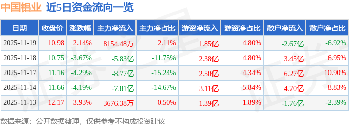 证券之星消息,截至2025年11月19日收盘,中国铝业(601600)报收于10.98元,上涨2.14%,换手率2.68%,成交量352.88万手,成交额38.59亿元。