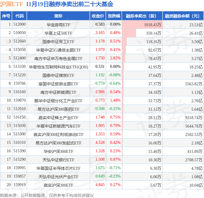 沪深ETF融券净卖出前三分别为:华宝券商ETF(512000)融券净卖出1018.43万股、华夏上证50ETF(510050)融券净卖出350.14万股、国泰中证军工ETF(512660)融券净卖出118.16万股,前20具体见下表: