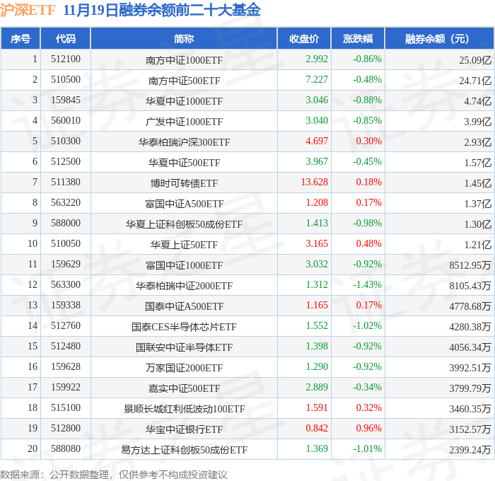 沪深ETF融券余额前三分别为:南方中证1000ETF(512100)融券余额25.09亿元、南方中证500ETF(510500)融券余额24.71亿元、华夏中证1000ETF(159845)融券余额4.74亿元,前20具体见下表: