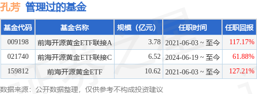 孔芳女士:中国国籍,北京语言大学本科学历,2010年7月至2020年11月任职于中衍期货有限公司,历任研究员、产品经理、投资经理、投资咨询部主管等职务,2020年11月加盟前海开源基金管理有限公司,现任量化投资部基金经理。2021年6月3日起担任前海开源黄金交易型开放式证券投资基金、前海开源黄金交易型开放式证券投资基金联接基金基金经理。孔芳女士具备基金从业资格。