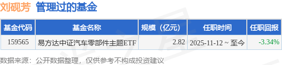刘砚芳女士:金融硕士,现任易方达基金管理有限公司研究员、易方达中证沪港深300交易型开放式指数证券投资基金基金经理助理。2025年9月26日起任易方达上证科创板综合增强策略交易型开放式指数证券投资基金的基金经理助理。2025年11月12日担任易方达中证汽车零部件主题交易型开放式指数证券投资基金基金经理。