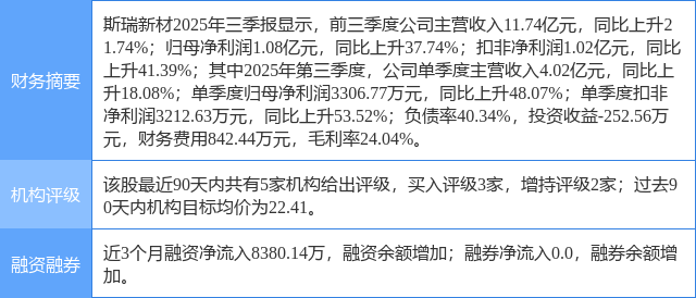 今日斯瑞新材(688102)涨8.41%,收盘报22.17元。