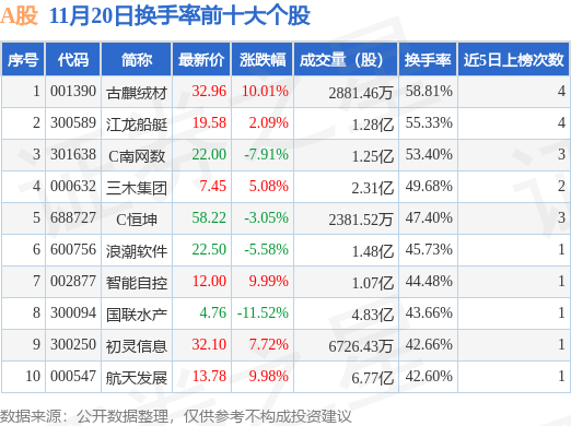 当日A股换手率前10大个股中6只个股收涨,平均涨幅7.48%,其中古麒绒材(001390)以换手率58.81%排第一,5只个股近5个交易日中多次上榜。